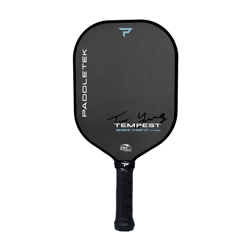 The Trae Young Signature Tempest Wave Pro-C was designed with 4X NBA All-Star, turned pickleball enthusiast, Trae Young to provide a combination of spin, control, and forgiveness. PT-700 unidirectional RAW carbon fiber is combined with our more forgiving Tempest core to give serious players both control and max spin capability. The legendary Smart Response Technology and a large, consistent sweet spot add finesse to every shot, while the balanced weight increases speed and maneuverability for even better play.